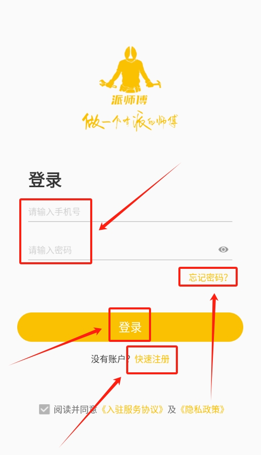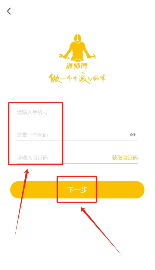 1、完成安装与账号注册:在应用市场搜索“派师傅”,安装完成后,依据提示完成注册流程并成功登录账号。