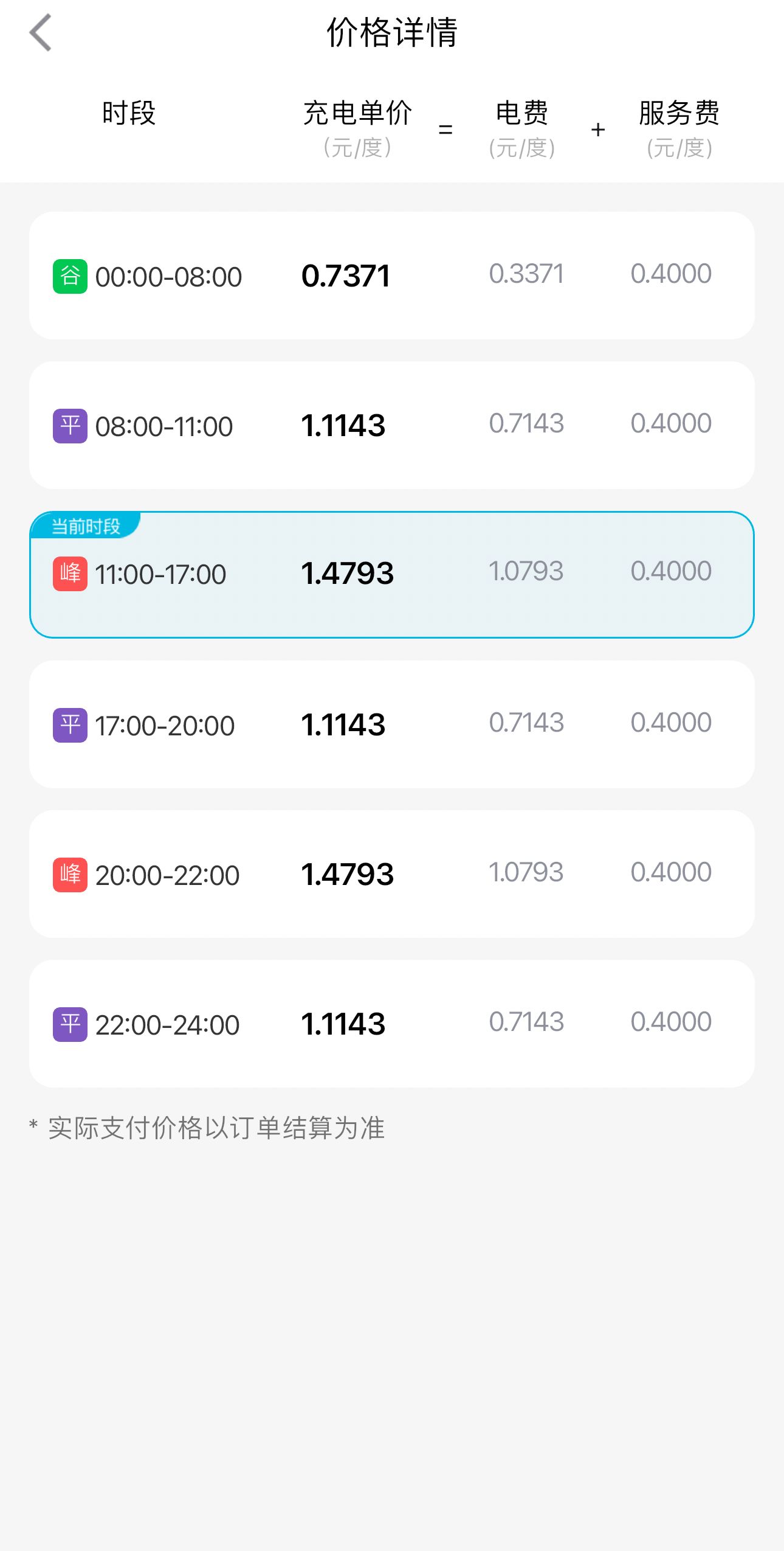 3、点击“价格详情”按钮,可对不同时段(峰、谷、平)的电费及服务费明细进行对比查看。
