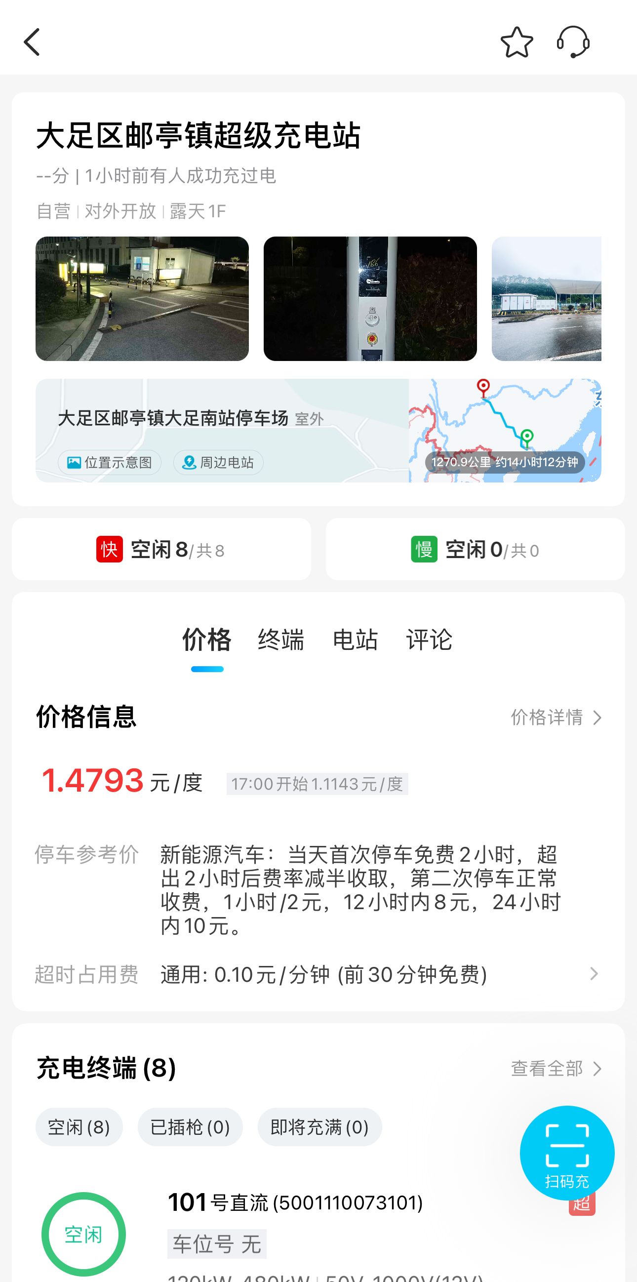 开启定位权限后,系统会自动智能推荐附近3公里范围内的最优充电站点,并实时展示空闲充电桩的数量以及具体的价格信息。