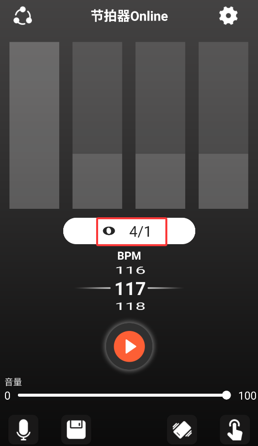 1、打开应用主界面后首先选择需要的具体拍号和速度参数,点击中央播放键即可立即开始基础节奏跟练模式。