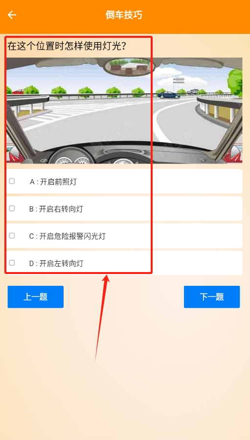 2、其中一种是倒车技巧答题,专门针对倒车方面的知识进行考查,帮助提升倒车技能。