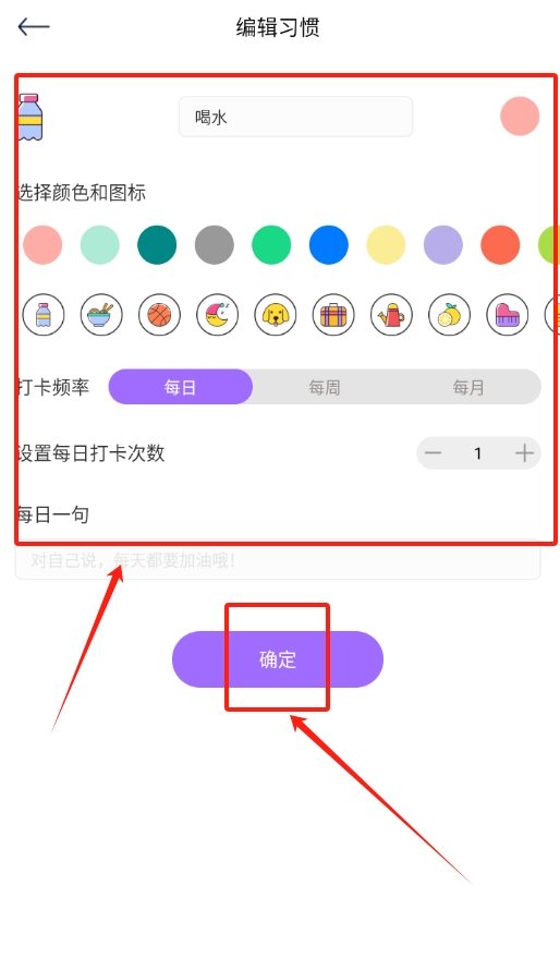3、填写事项的打卡频率,选好颜色或图标后点击确定就设置好了。