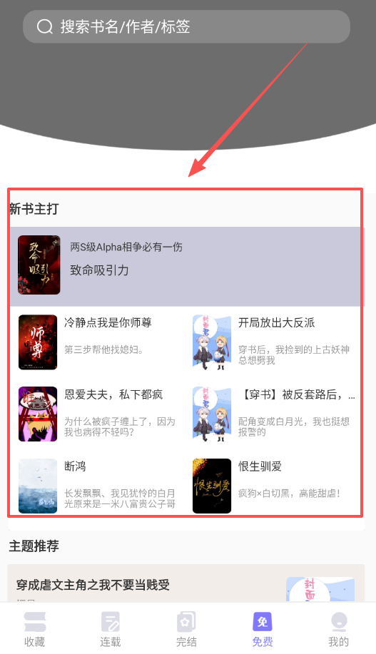 4、其推荐算法十分智能,在“新书主打”与“主题推荐”板块,会呈现诸如“穿成虐文主角之我不要当贱受”这类专题内容。