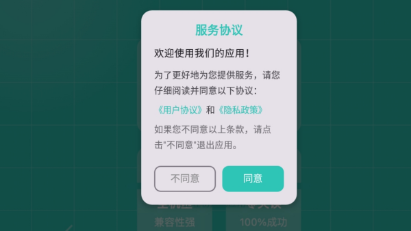 用户启动软件后,需先阅读服务协议,点击“同意”按钮,即可进入后续页面。