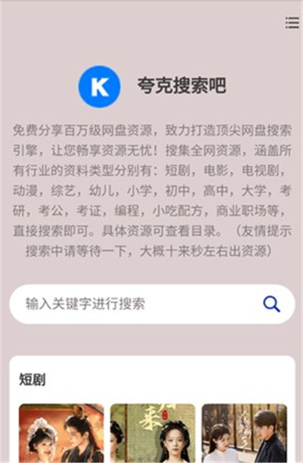 夸克盘搜,作为夸克网盘的资源搜索引擎,是一款功能强大的资源检索工具,可支持多种不同类型的资源查找。借助先进的智能算法,它能够精准捕捉用户的实际需求,迅速呈现出与需求最契合的搜索结果。夸克盘搜具备极速的搜索体验,这不仅有效提高了搜索的效率,还能让用户不必长时间等待,快速获取到自己需要的资源,堪称一款实用的生活好帮手。
