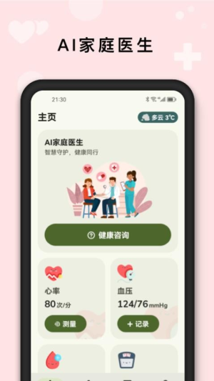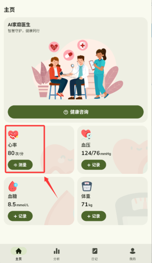 打开AI健康管家应用,在功能菜单里找到“心率测量”模块并点击进入,即可进入测量界面准备启动测量。