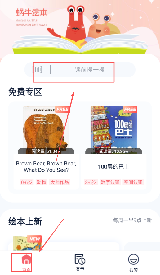 1、打开蜗牛绘本应用,在首页找到搜索输入框,输入想要查找的故事书书名,即可搜索到对应的绘本,整个操作过程十分简便。