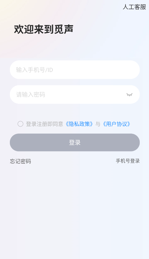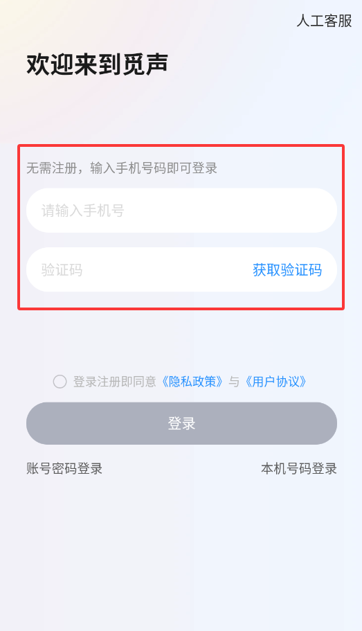 1、打开觅声应用后,进入登录界面,输入手机号并获取验证码,无需注册步骤即可完成快速登录。