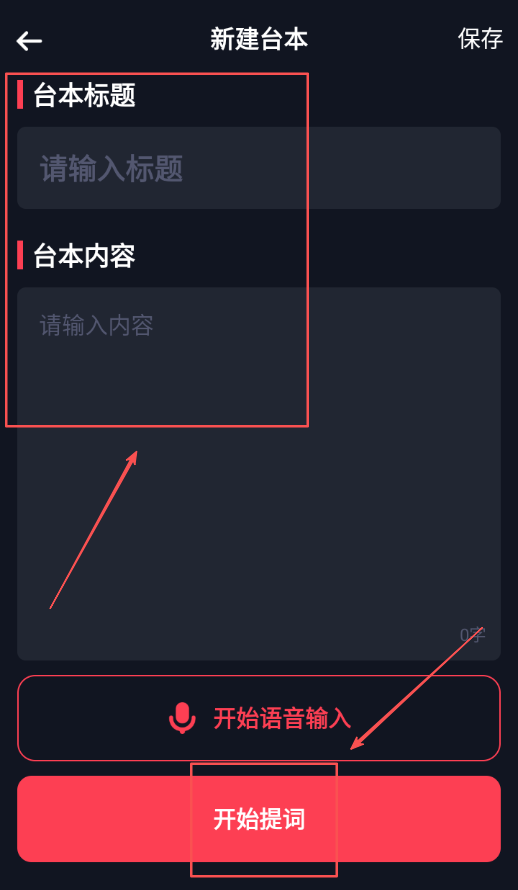 4、进入台本填写页面后,依次录入台本的标题与具体内容,在确认所有信息填写准确无误后,点击“开始提词”按钮即可启用提词功能。
