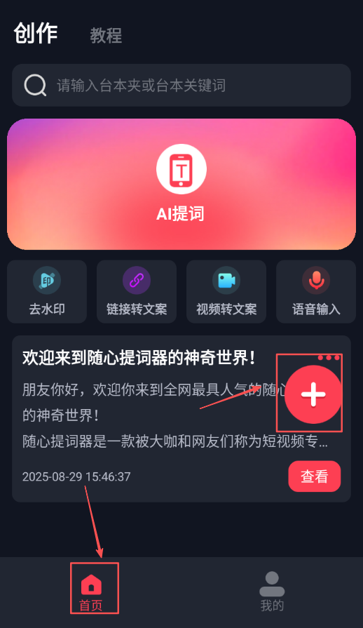 进入软件主界面后,在首页醒目的位置找到加号按钮,点击该按钮,即可调出添加新内容的功能选项菜单。