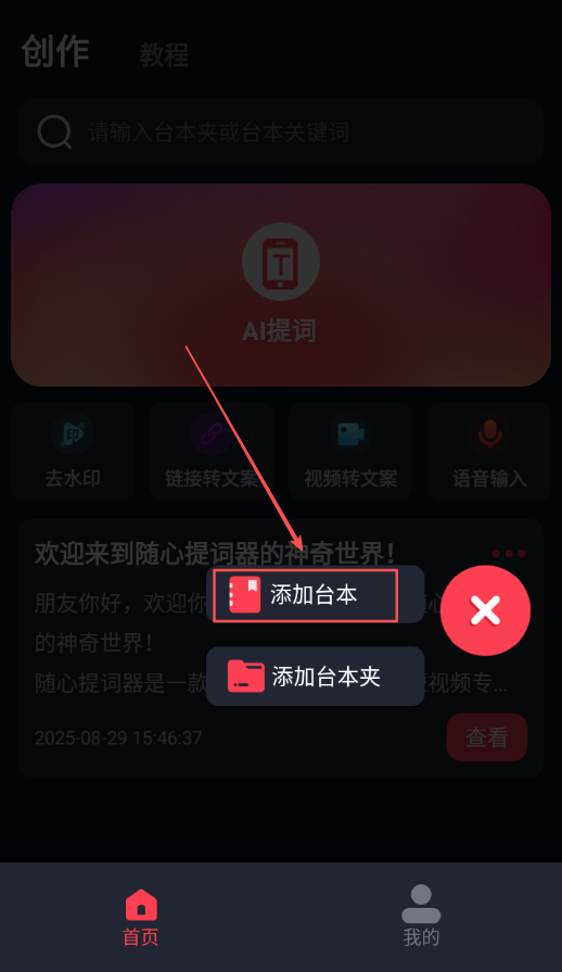 3、在弹出的功能选项菜单里,找到添加台本的选项并点击,即可进入台本信息填写的专属操作界面。