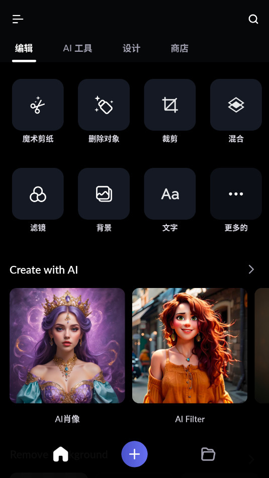 1、启动LightX应用,点击界面底部的加号图标,即可开启新项目创作或对已有图片进行编辑操作。