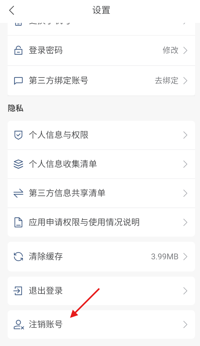 3、进入设置页面后向下滑动浏览,在功能列表的底部找到显眼的“注销账号”选项。