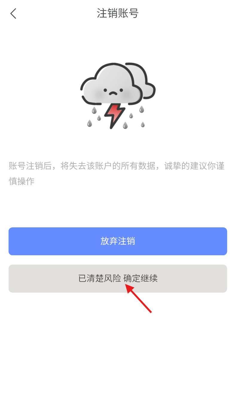 4、请仔细阅读注销风险提示,在确认已充分了解相关后果后,点击“确定继续”按钮,以完成账号注销操作。