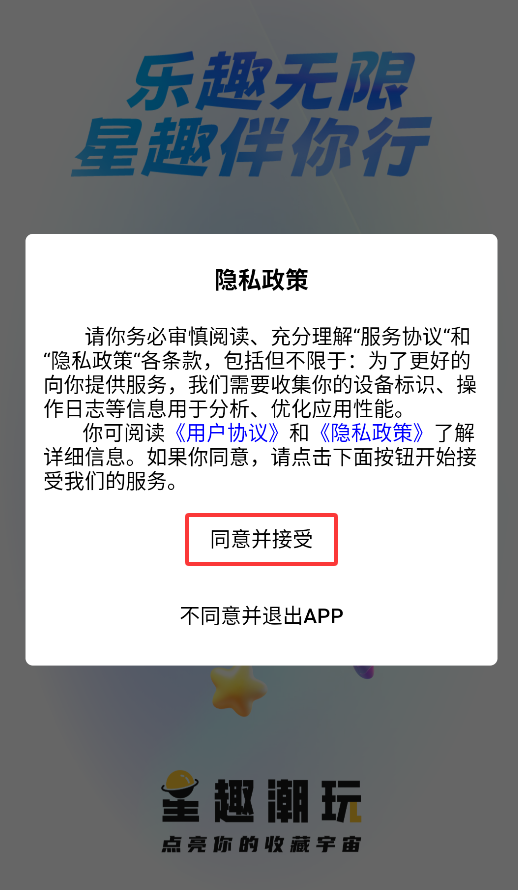 1、首次启动会显示隐私政策窗口,点击"同意"按钮后进入潮玩平台主界面。