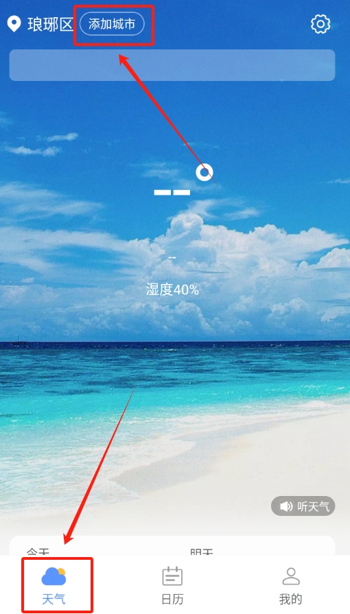 1、打开软件直接看首页,左上角有个小小的添加城市按钮,点它就能开始操作了。