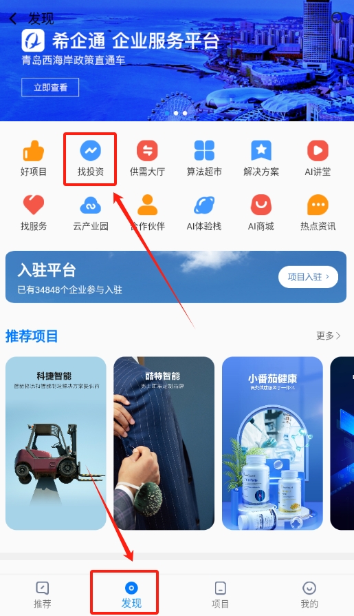 4、看完视频后在底部功能栏切换到发现页面,在页面中找到找投资相关板块,点击进入即可查找投资信息。