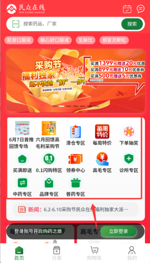 1、进入民众在线后,在首页栏直接点击"药品专区"按钮,跳转至药品选购页面。