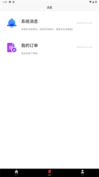4、消息页面可以接受系统消息,还可以查看我的订单,购买后可以在这里查询订单详情。