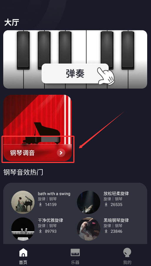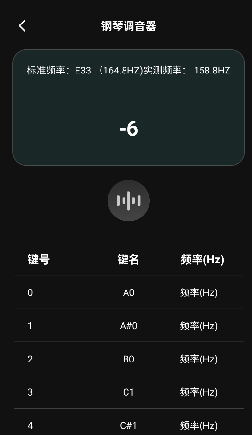 1、打开应用后,在首页选择"钢琴调音"功能,将手机靠近钢琴,应用会自动检测琴弦震动频率。
