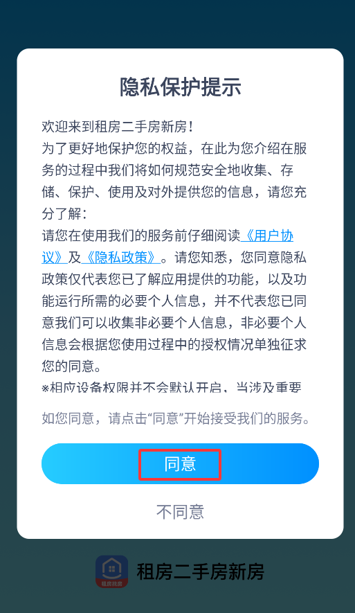 1、首次打开租房二手房新房时,系统会弹出用户协议确认窗口,点击"同意"后方可进入应用主界面。