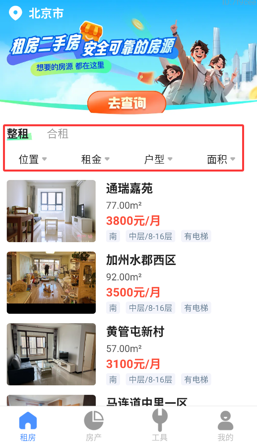 2、在租房专区可根据需求选择整租或合租,支持按区域、价格、房型和面积等条件筛选房源。