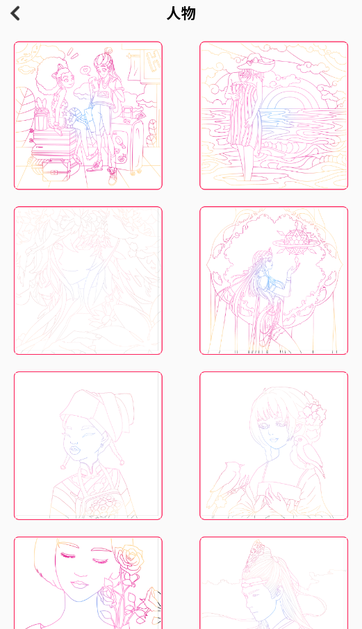 2、从素材库挑选喜欢的线稿图案,包括动漫人物、风景等多种主题模板。