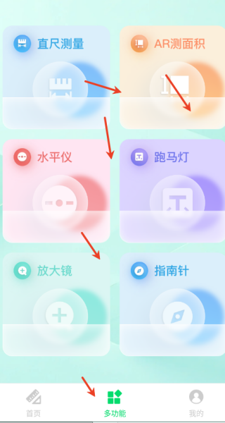2、集成多种实用工具,除核心测量功能外,还包含 CM 直尺测量、AR 测面积、水平仪、跑马灯、放大镜、指南针等工具。