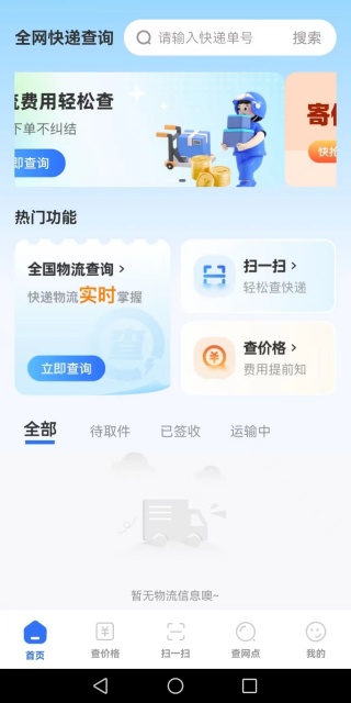 2、进入软件首页,支持全网快递一键查询,输入单号即可快速查询。