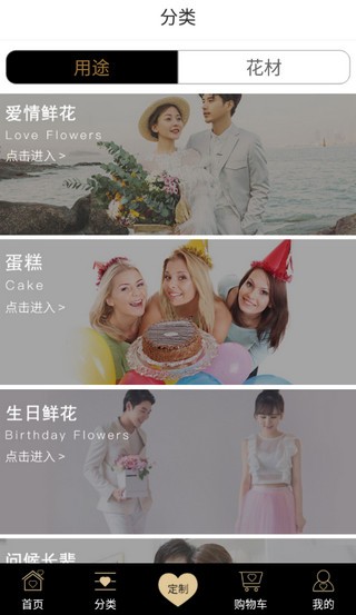 2、分类板块种设置了详细的分类,例如用途与花材,方便用户进行订购。