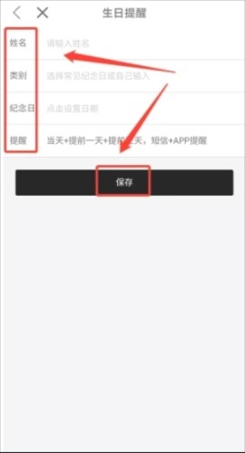 4、填写好姓名、类别、纪念日日期以及提醒方式,最后点击【保存】即可完成添加。