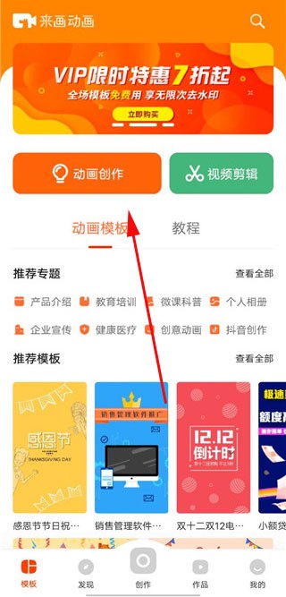 1、打开来画动画应用后,在首页找到并点击“动画创作”这一功能选项。