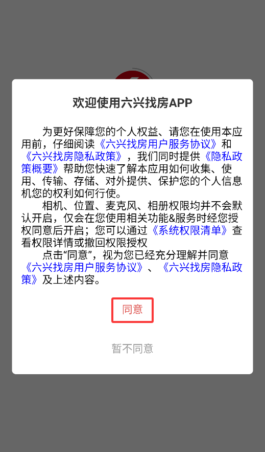1、首次启动时会弹出用户协议窗口,点击“同意”按钮即可进入房产服务平台的主界面。