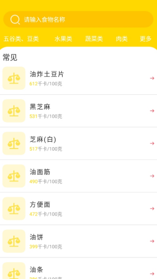 2、点击“热量查询”选项,即可在此查看多种食物的热量信息。