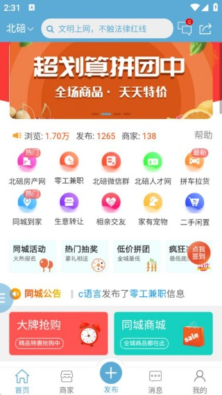 1、打开平台首页,能看到各类生活服务可供选择,像零工兼职、拼车拉货、同城到家等服务都能在线办理。