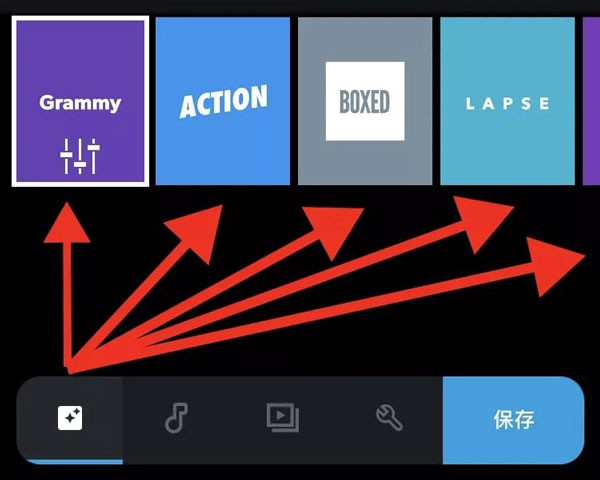2、挑选心仪的模板,模板里带有转场特效,其中一些特效是随音乐自动触发的,无法手动添加,同时还能对字体、滤镜和图形进行自定义设置。