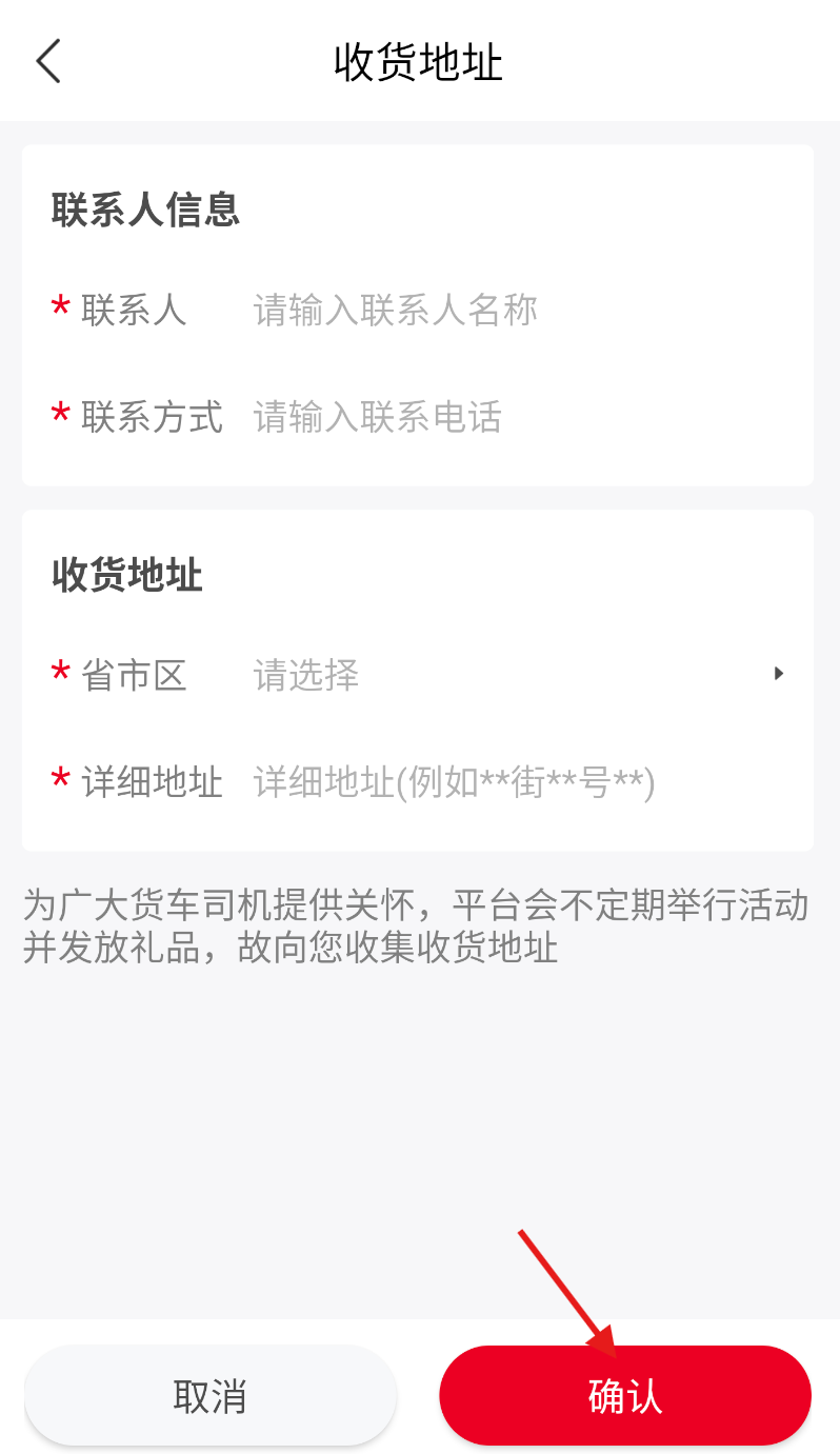 3、进入收货地址页面后,请依次填写联系人姓名、联系电话以及详细的收货地址等相关信息,仔细核对确认所有内容准确无误后,点击“确定”按钮完成信息保存。