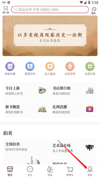 1、用户在进入孔夫子旧书网首页后,点击屏幕下方功能栏中的“我的”。