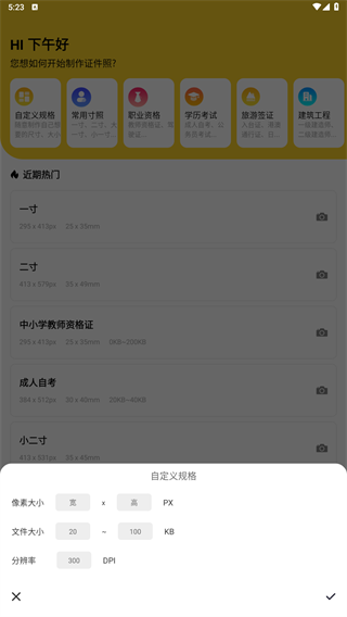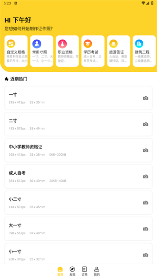 2、进入首页,查看展示的证件照类型和热门的尺寸