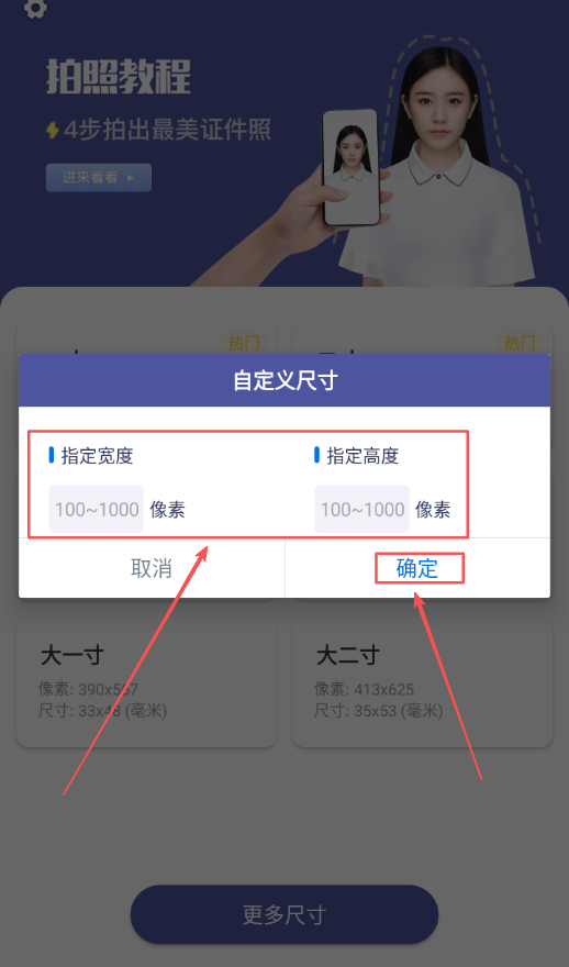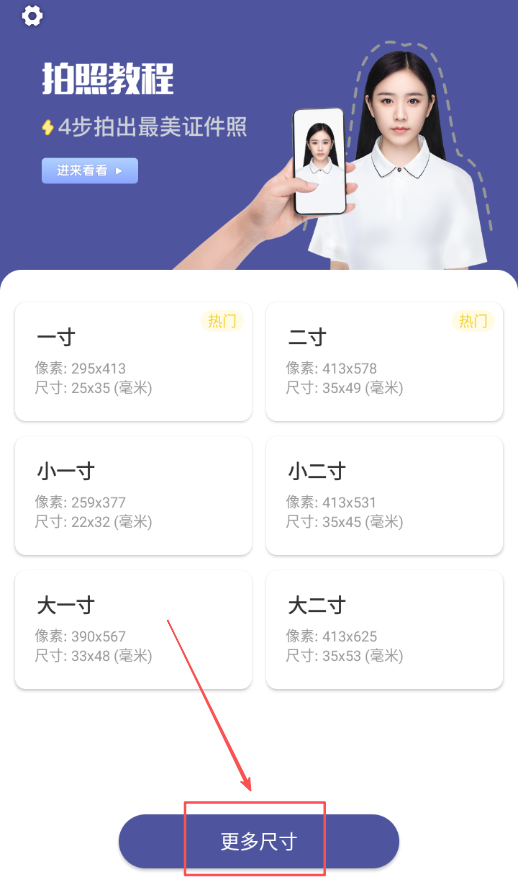 3、看完拍照步骤后,返回至证件照尺寸选择界面,可从预设的尺寸规格中挑选一个合适的,若没有符合需求的则选择自定义尺寸选项。