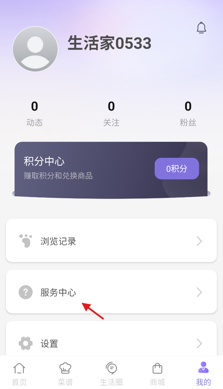 2、进入 “我的” 页面后,下滑界面找到 “服务中心” 板块,点击该选项跳转新页面。