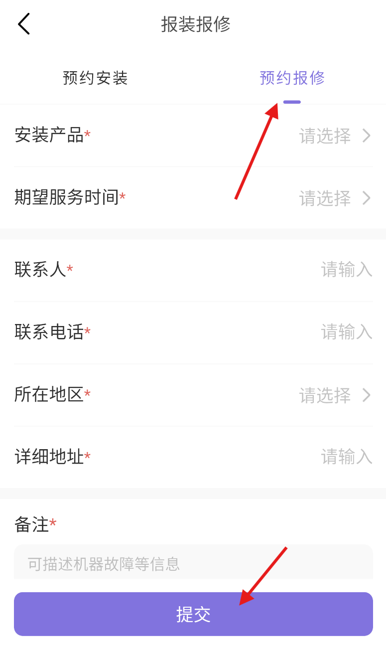 4、进入预约报修页面,详细填写设备问题、联系方式等信息,确认无误后提交申请。