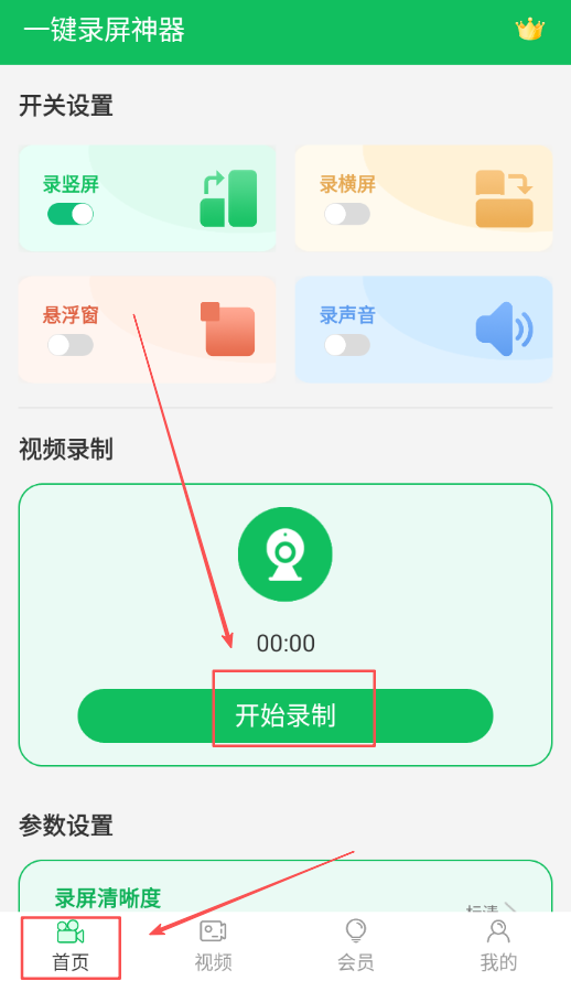 3、设置录屏参数时,在软件录屏设置页面,选择录制模式(横屏 / 竖屏),挑选合适的分辨率和清晰度,确认设置后再开始录屏。