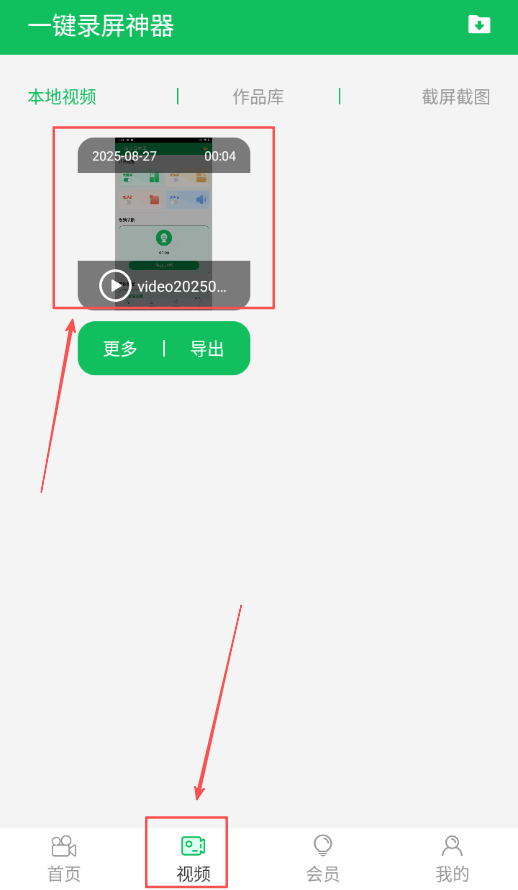 4、录制完成后停止录屏,在软件内找到视频页面入口并点击进入,在视频页面中就能看到所有已保存的录屏视频文件。