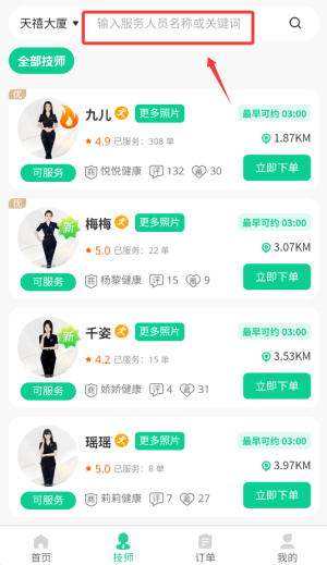 2、通过搜索栏输入关键词查找特定服务,或直接筛选附近的服务人员查看评价。