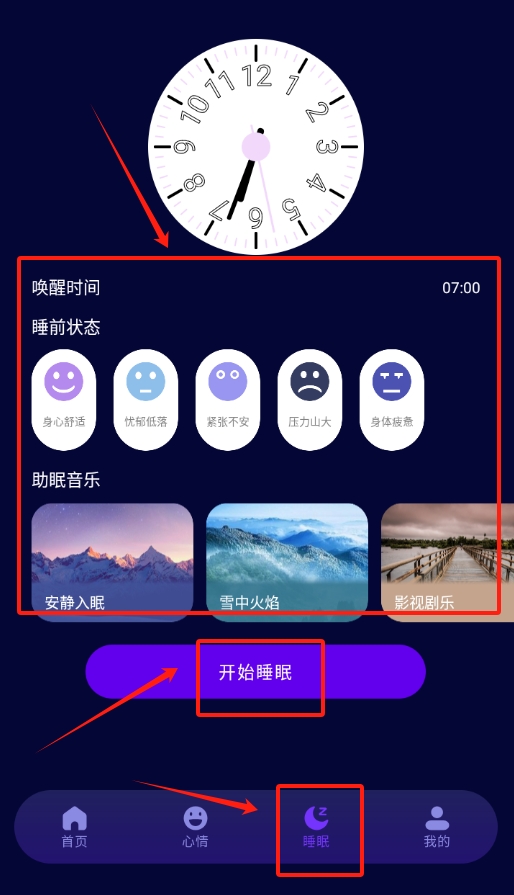 2、接着选选睡前的状态,再挑一首喜欢的助眠音乐,然后点击开始睡眠按钮。