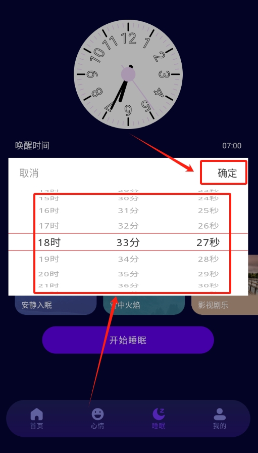 1、打开罐头冥想软件,进入睡眠页面,选好想要起床的时间,点一下确定按钮。