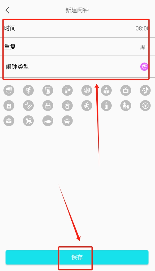 3、 接下来会弹出设置框,按提示依次输入想要的时间,选好是否重复、闹钟类型,确认无误后点击保存即可。