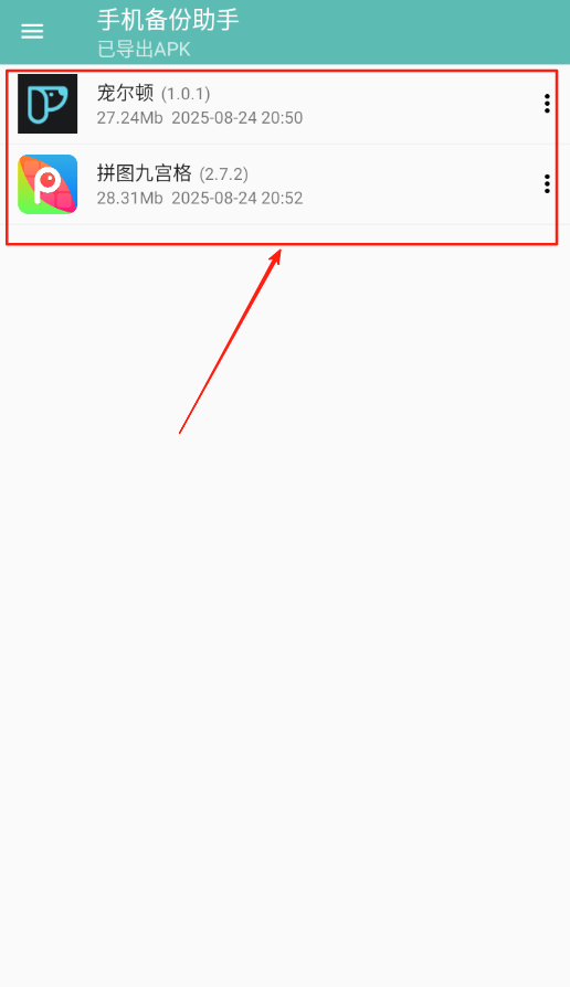 1、打开手机备份助手后在软件列表里选择需要备份的软件,点击该软件进入详情页面。