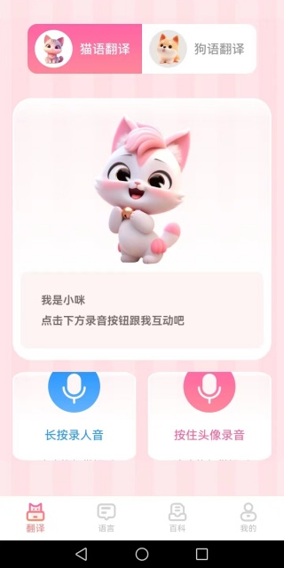 3、软件首页可以选择猫语翻译,也可以选择狗语翻译,然后按住录音可以进行翻译。